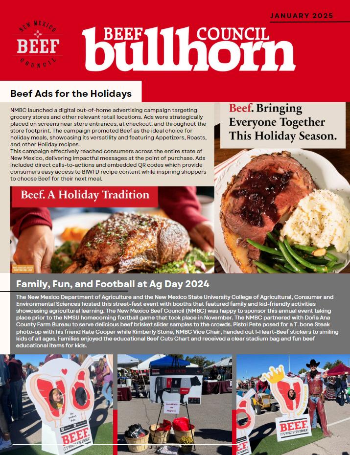I want to thank you for coming to the Joint Stockmen’s Convention in December I have rarely felt the support and comradery in the love of our organization and industry than what I felt at the convention! I am humbled beyond words and know that your NMCGA team strives daily to stand up for what’s right. Ya’ll make this job fun, so thank you for that! I pray that 2025 is full of Good Health, Fun, Family, Friends, Lots of Green Grass, Low Feed Prices, Fat Cattle, and High Calf Prices!