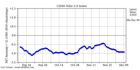 The “legacy drought” over the far southern parts of the state is still hanging around and likely not going to get better this winter Why? Well, we’ve got a weak La Niña in place and that is rarely good for New Mexico and the surrounding region The graphic below shows that this is not a strong event and you can see how it has waxed and waned since earlier this fall