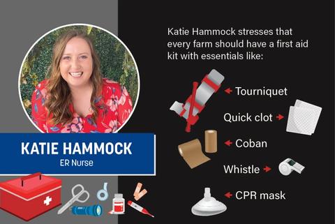 “If it’s a serious enough accident, it can take fewer than five minutes to bleed out,” Hammock says, underscoring the importance of every farm having a first aid kit that incorporates essential items such as: