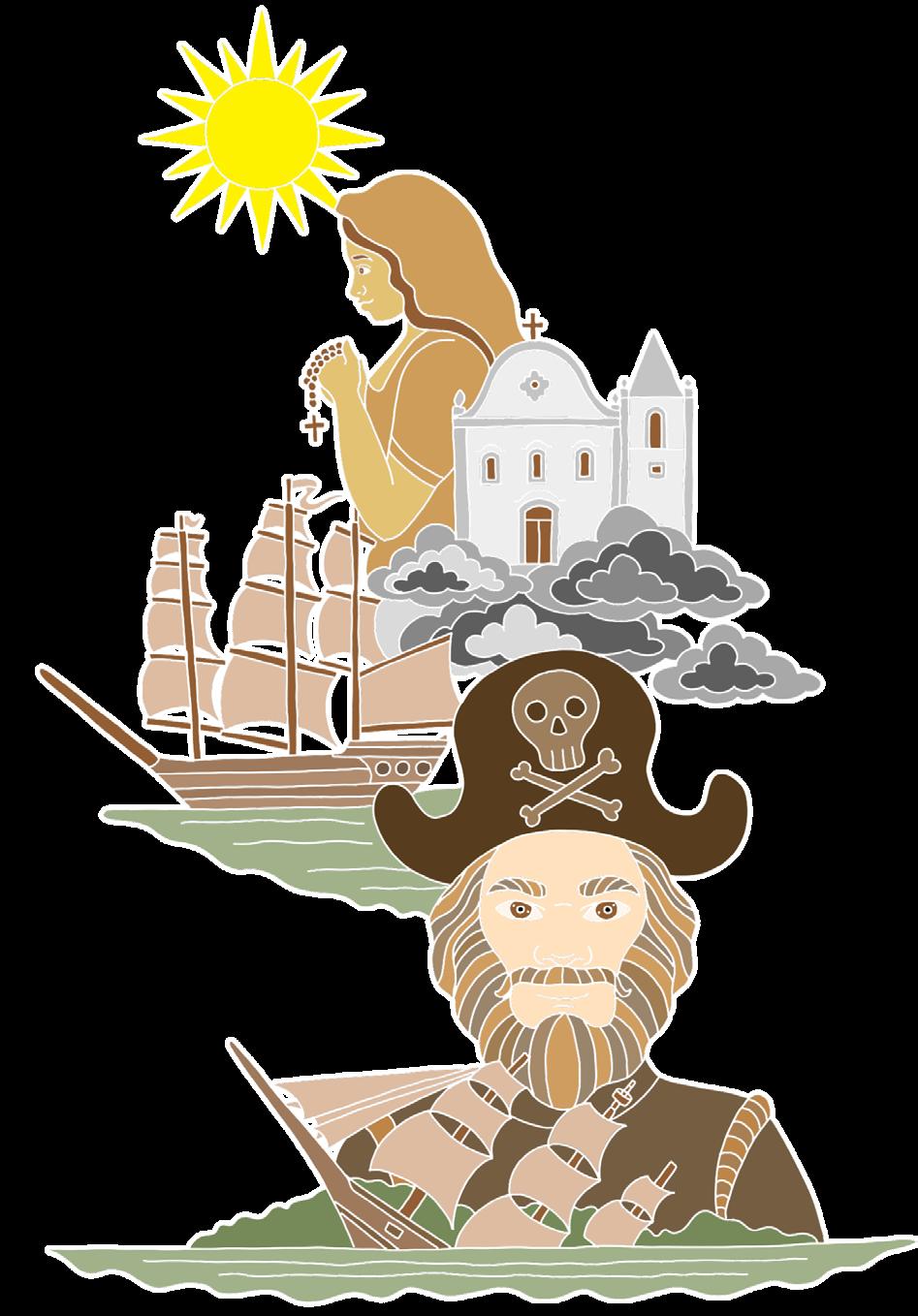 Desesperados, os mora dores se reuniram na igreja matriz e começaram a rezar o rosário, implorando pela proteção da padroeira, Nossa Senhora do Rosário. Foi então que o céu escureceu e uma tem pestade se formou! Desprevenidos e sem tempo para se esconder, os piratas foram atingidos pela fúria da natureza e naufragaram.