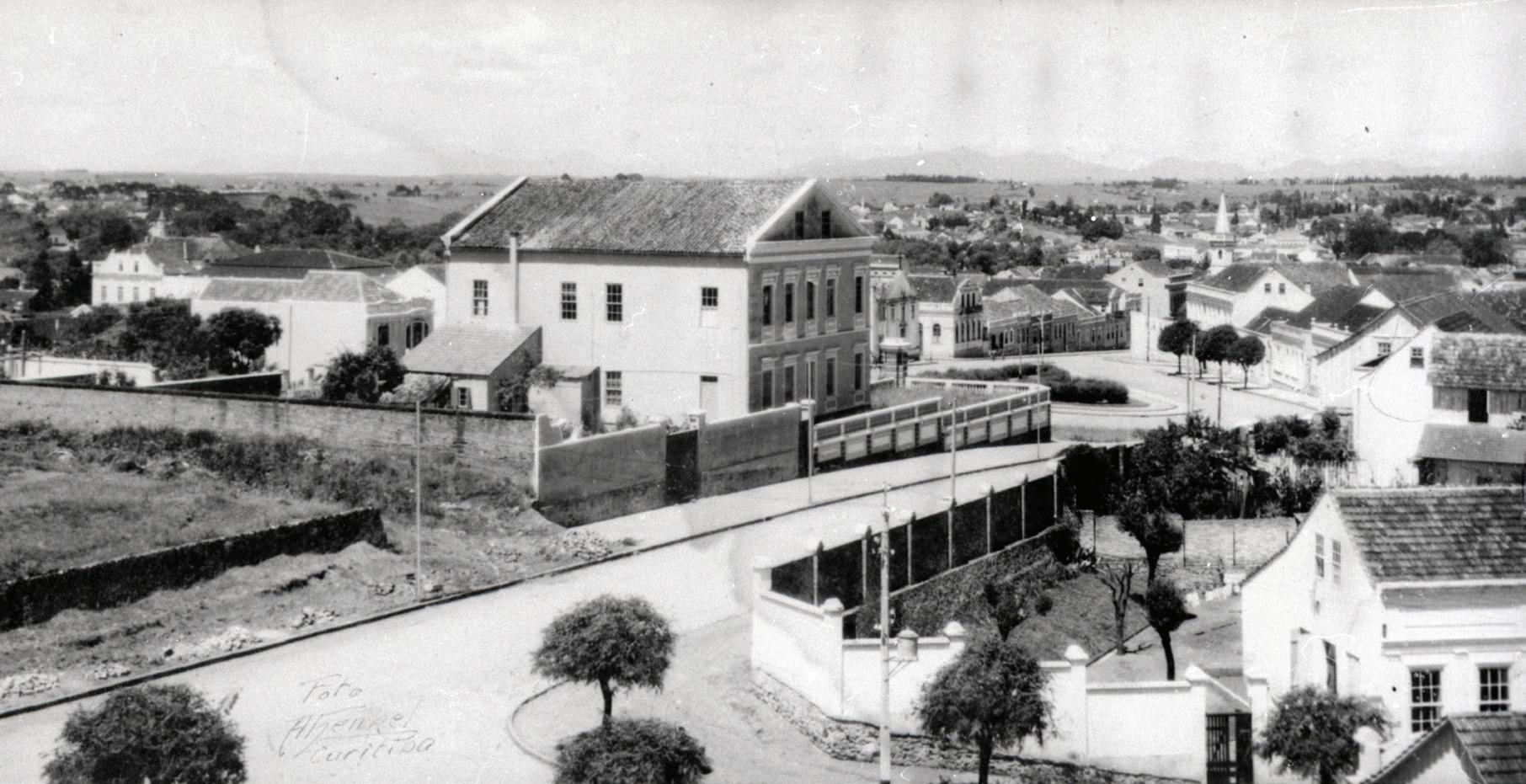 Vista panorâmica do Centro Histórico de Curitiba, tomada da residência de Julio Garmatter (atual sede do Museu Paranaense), em 1928.