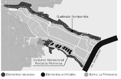 este artículo se adentra en el pasado y presente de una de estas poblaciones ubicadas al borde de estos causes de agua específicamente, el barrio La Primavera, que se encuentra al noroccidente de Quito, delimitado por dos quebradas que lo surcan de norte a sur, y que lo separa de sus barrios colindantes San Vicente y la Comuna Santa Clara de San Millán Para este caso, en particular, nos centraremos en la quebrada de Rumipamba, que colinda con el barrio San Vicente, por ser la de mayor importancia para los habitantes de La Primavera, al tener una vía pavimentada que la bordea, estar cruzada por un puente vehicular y otro peatonal, y ser la que concentra más población Las edificaciones son de diferentes épocas, van desde las más antiguas hasta construcciones recientes, algunas de ellas en riesgo por su cercanía a la quebrada