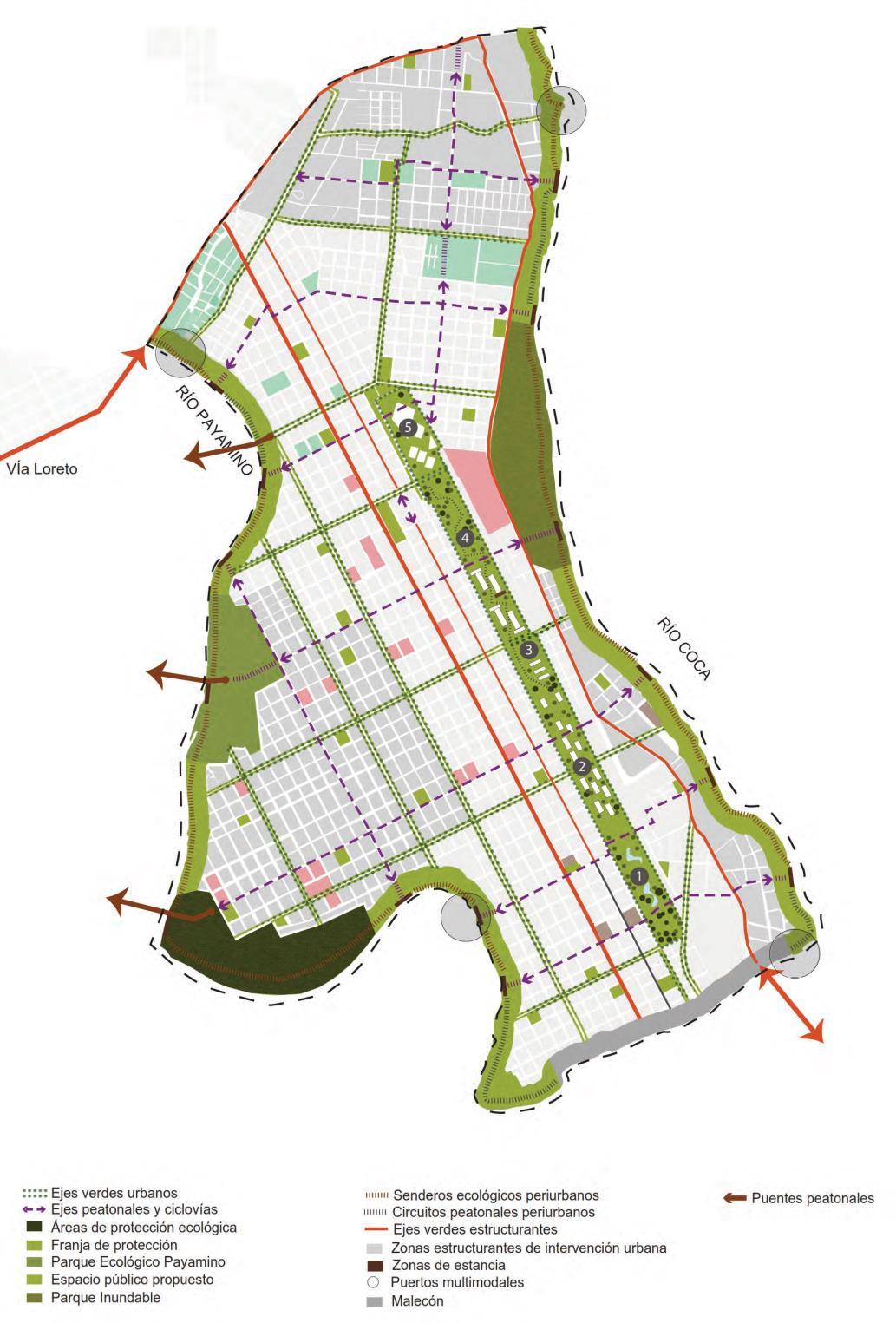 El proyecto urbano en Francisco de Orellana, El Coca propone un Plan de Ordenamiento Territorial con una visión sistemática del contexto urbano y con su complejidad, generando soluciones físico-espaciales coherentes con sus particulares requerimientos tecnológicos, estructurales y medioambientales al mismo tiempo, motivar a atender las necesidades integrales de la población de la ciudad del Coca, significando aportes creativos, funcionales e innovadores para el mejoramiento de su habitar y calidad de vida además de un desarrollo en los ámbitos sociales, culturales, económicos y ambientales comprendiendo el contexto con sus problemas y potencialidades dentro de la zona de estudio La consideración central de las estrategias de intervención son las amenazas de inundación, esto como modelador de los límites y lógica de trabajo La visión del proyecto considera que el aeropuerto (estructura urbana clave) con el tiempo en función de las dinámicas económicas, debe ser reemplazado por un equipamiento urbano público multiuso