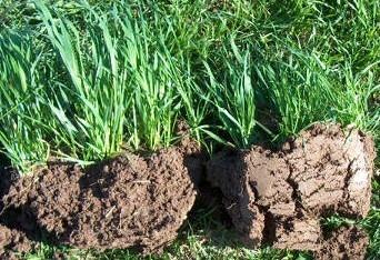 ◊ The soil on the left is what soil can look like when it has been highly structured by MycorrPlus. It is aerated and crumbly.
