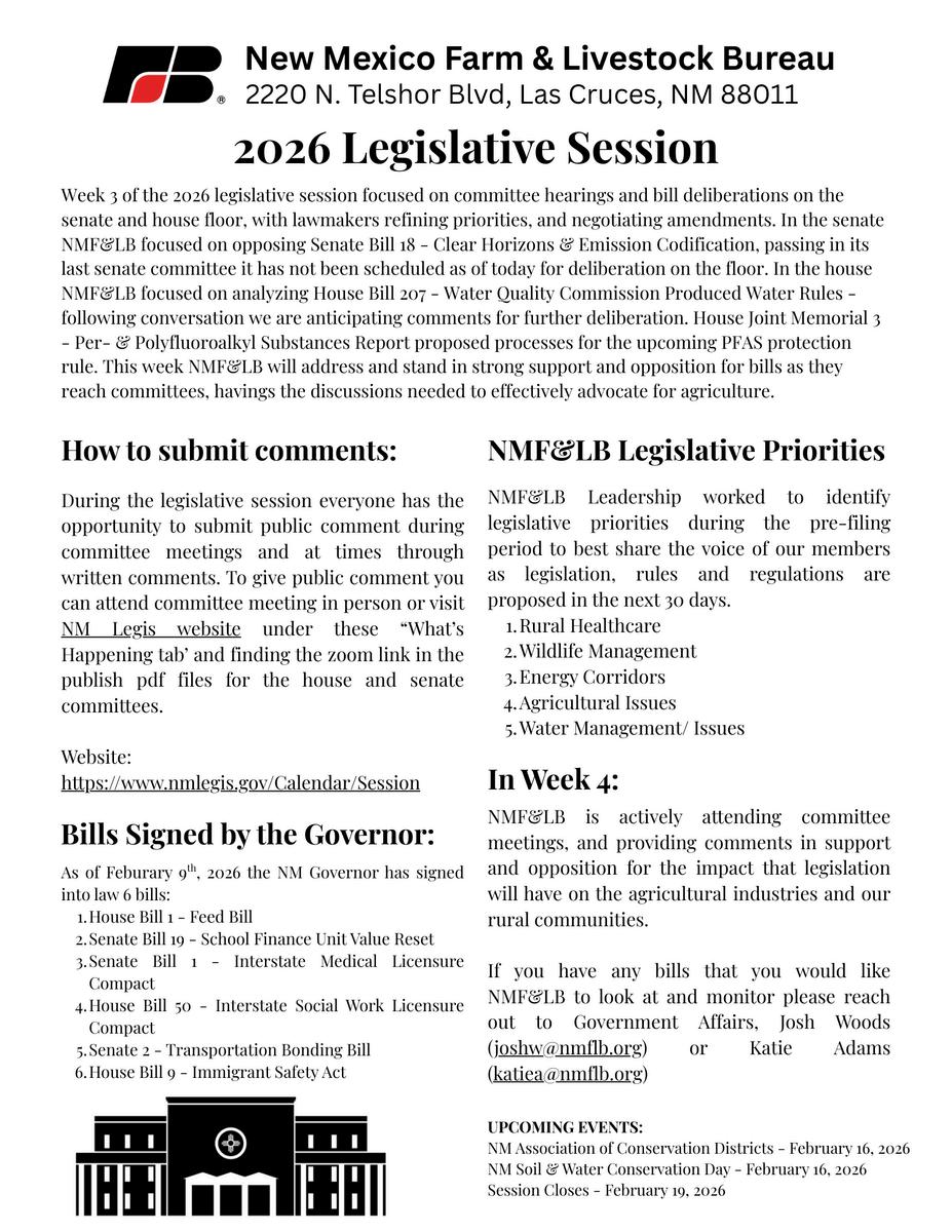 The 2026 30-day legislative session proved to be both fast-paced and highly productive. It was a period defined by strong advocacy efforts, meaningful relationship-building, and important outcomes for New Mexico agriculture. This edition provides a comprehensive overview of what was accomplished.