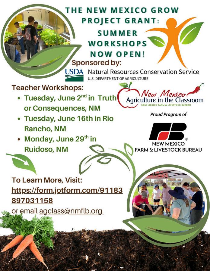 New Mexico Agriculture in the Classroom is a program of the New Mexico Farm and Livestock Bureau that works to connect students and educators with agriculture The program provides agricultural literacy resources for K–12 students and offers professional development and inservice training opportunities for teachers. Through hands-on lessons and classroom resources, NMAITC helps students better understand where their food and fiber come from and the important role agriculture plays in everyday life.