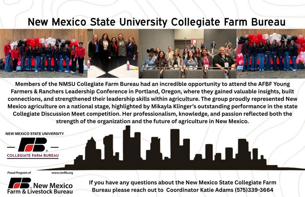 In March, NMFLB staff attended the Young Farmers and Ranchers Leadership Conference alongside members from New Mexico State University Collegiate Farm Bureau. This event focused on critical topics such as succession planning, addressing agriculture issues, and equipping the next generation of producers with the tools they need to continue family legacies. NMFLB also supported County Farm Bureau organizations in setting advocacy goals tailored to local needs. Additionally, NMFLB leadership traveled to Washington, D.C., to advocate for a new Farm Bill, emphasizing the importance of federal support for the state’s agriculture sector.