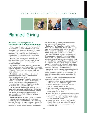 the Foundation will use the proceeds to carry out your charitable objectives. Retirement Plan Assets from qualified 401(k), Keogh, 403(b), IRA, or profit sharing plans can be used to create a charitable fund in your name. Gifting retirement plan assets may also reduce estate tax liabilities incurred by your heirs. Ritchie Houge, Vice President of Philanthropic Services, is your resource for information about ways to give and types of gifts that will benefit your long-term charitable objectives for the most direct and lasting impact. Please call him toll free at 1-800-659-7859 or e-mail ritchh@nwmf.org. He would be happy to meet with both you and your financial/legal advisor(s) to establish a gift vehicle that most effectively meets your needs. Please visit the Northwest Minnesota Foundation web site www.nwmf.org and click on our Planned Giving Guide for complete, comprehensive and easy-to-understand information about your gift options. Our site contains a comprehensive resource for your gift planning questions. • Discover all of the tax and income benefits of the various kinds of planned gifts. • Read in-depth about trusts and annuities that pay you an income for life. • Get tips on how you can make gifts from life insurance policies, retirement plan assets or appreciated property. • Learn how to set up your will so that the government does not benefit more than your heirs. • Discover a virtual encyclopedia of information on how and what to give. • Access hundreds of up-to-date articles on making the most of your charitable giving. • Calculate your income tax deduction for charitable gifts.