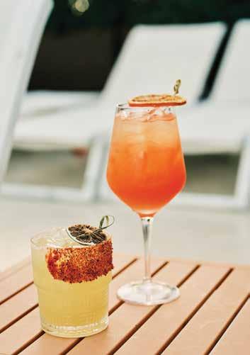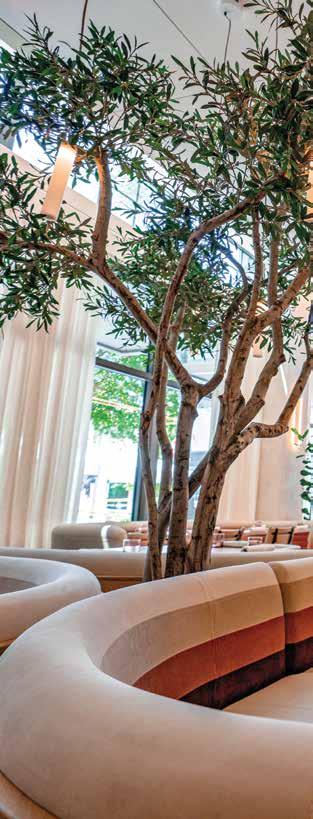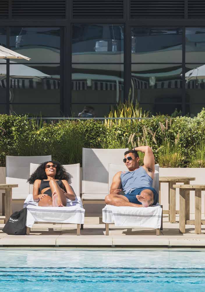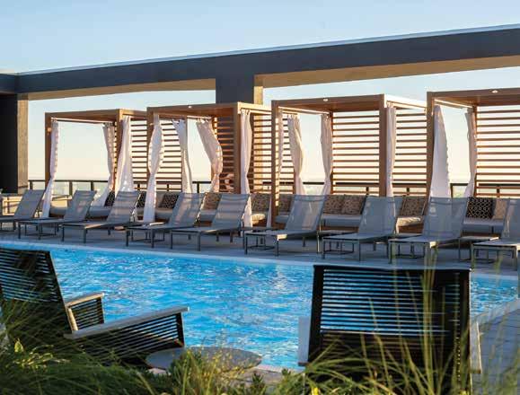 But let’s get to the reason why you’re here: the hotel’s 9th-floor, show-stopping outdoor pool (pictured on previous page), ringed with vibrant pink bougainvillea flowers, Japanese blueberry trees, and cabanas draped in gauzy white curtains, inviting guests to relax. “The pool at The Tampa EDITION is the premier destination for a relaxing poolside retreat featuring delicious bites, refreshing cocktails, and panoramic views over downtown Tampa,” says Christine Judson, the hotel’s Director of Sales and Marketing. “On weekends, the tropical oasis transforms into an electrifying evening cocktail lounge with top DJs spinning the night away.”