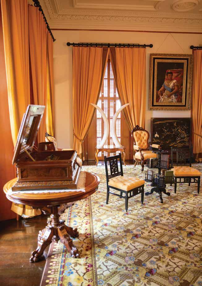 “The palace is more than just that building, it is the entire site,” Mason says. The 10-acre site is surrounded on all four sides by a low wall topped with a greenpainted fence with two layers of gilded gold spearheads, which was completed in 1892. At each of the four main entrances are four pillars and ornate gates that display the coat of arms of the Hawaiian Kingdom. In 1918, the Territorial government removed the inner pillars and gates to widen the road to accommodate cars, so in 1982 Mason reconstructed the pillars and returned the gates to how they looked in the 1800s, when horse-drawn carriages were often used by the Hawaiian royalty.