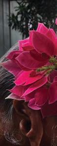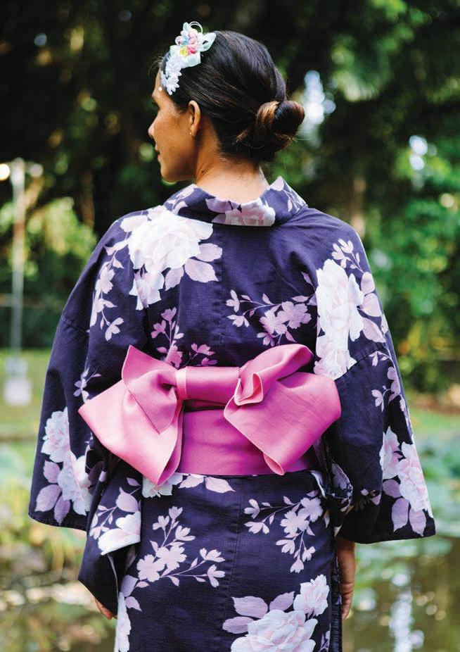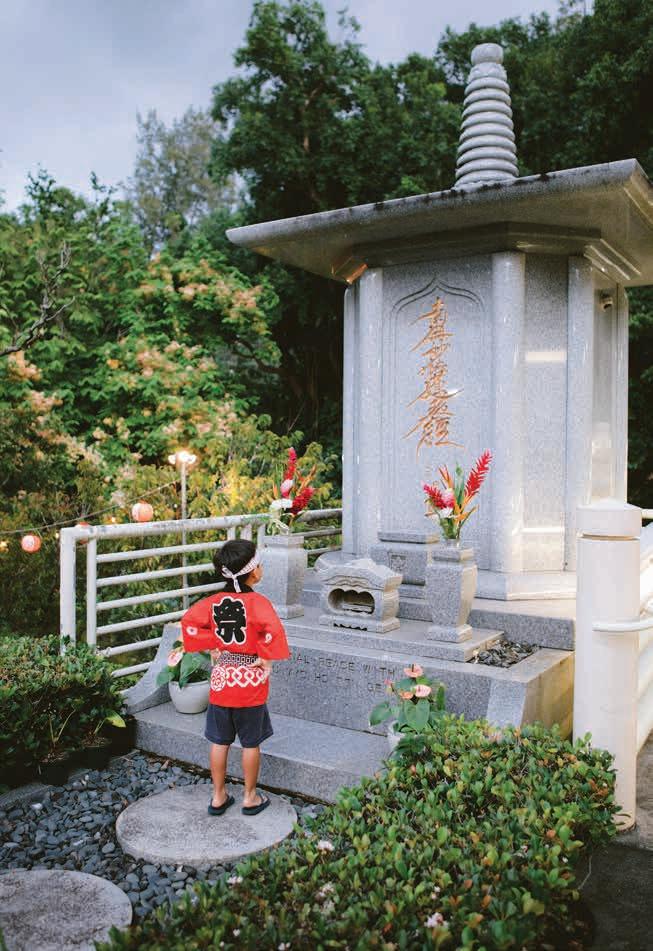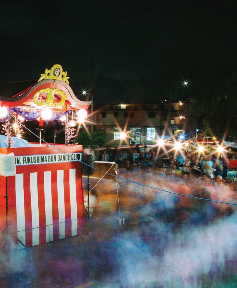 accompaniment — dancers move in step to the music and gracefully clasp their palms, nod, then bow to the lilting sounds of the shakuhatchi, a bamboo flute, and shamisen, a three-stringed instrument. In Japan, Bon Odori music leans toward traditional song, but in Hawaiʻi, the playlist also includes more pop variations, to the crowd’s delight.