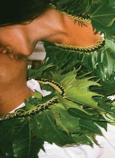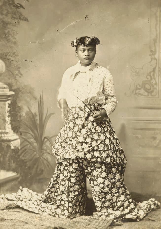 Simple fabrics gave way to the ornate. Yards of satin and silk in striking colors were folded in various styles, bustles and pleats fastened into place with kukui nuts by expert pāʻū drapers. “That must have been such a beautiful sight to see all the different printed pāʻū and the leis they made to show off,” says Kimo Alama Keaulana, a modern-day pāʻū draper.