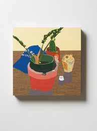 At present he’s working on three pieces, all still lifes linked to his own recollections: Daiei depicts a plump pigeon roosting next to a corky ‘ihi stem (a native succulent) protruding from an earthen pot bearing the logo of the old-school Japanese grocery store which Yoshizumi frequented with his grandparents; Winnie’s Chickens shows several roving roosters and hens, necks cocked at various angles, against a flat abstraction of green grass, inspired by his fiancé’s aunty’s coffee farm; Hawai‘i ’75 captures fallen plumerias, with their tissue-thin petals and yellow centers, scattered atop a 75-pound