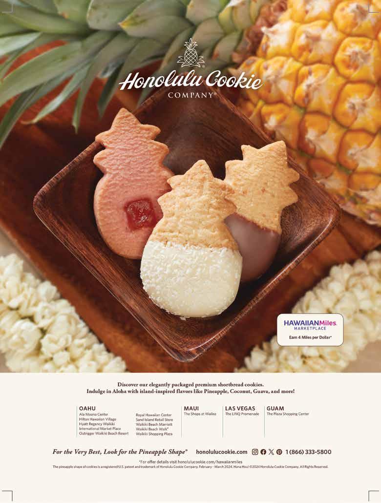 Our Wave collection comes in several styles and sizes and is available in 14K Yellow, White or Rose Gold. An incomparable collection of Hawaiian and Island lifestyle jewelry HAWAII’S BEST People’s Choice Awards The Star-Advertiser 2014 – 2023 OAHU • MAUI • K AUA I • BIG ISLAND OF HAWAI I • NCL PRIDE OF AMERICA BELLEVUE • BOSTON • CH ICAGO • DALLAS • DENVER • L AS VEGAS • NEW YORK ORLANDO • PHILADELPHIA • PLEASANTON • PORTLAND • ROSEVILLE • SAN DIEGO SAN FRANCISCO • SAN JOSE • WASHINGTON, D.C. NaHoku.com • 1- 800 -260 -3912 NAHO-36571_OpalUltWave_HanaHou_FebMar2024_7.3x9.8.indd 1 12/4/23 8:06 AM