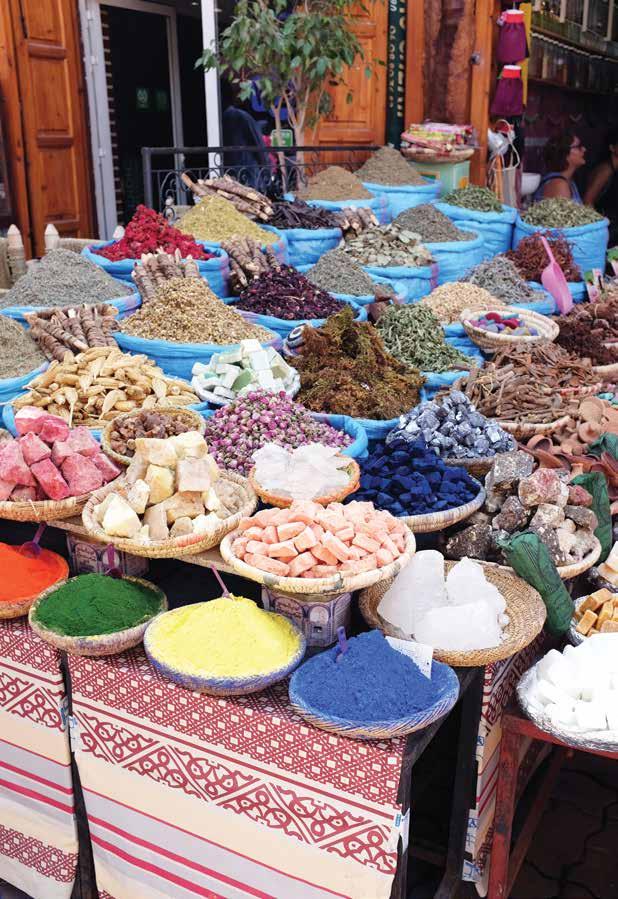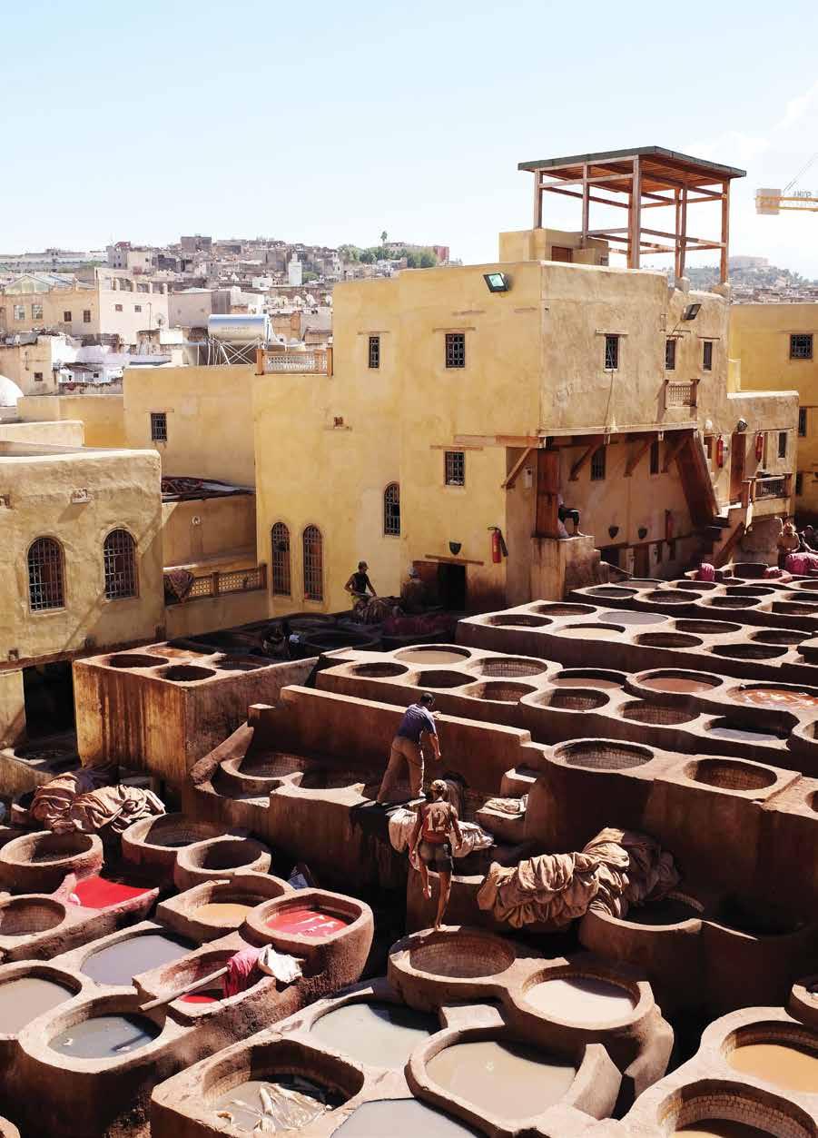 The medinas of Morocco smell of roses, orangeblossom water, and donkey manure. My two friends and I arrive in Fez past midnight. A taxi takes us through the wide, paved streets of the new town and then leaves us just outside the medina, the old walled city. Within, cars are not allowed, nor would they even be able to fit if they were. Following our guide on foot, we slip past the walls and into a maze of darkness and silence. A left here, a right, a left … wait, was it a left? The narrow streets all look the same; the tightly packed, duncolored buildings hem us in. We pass through a wooden door in a dead-end alley, and suddenly, we are in a haven stretching three stories above us. Tiles saturated with
