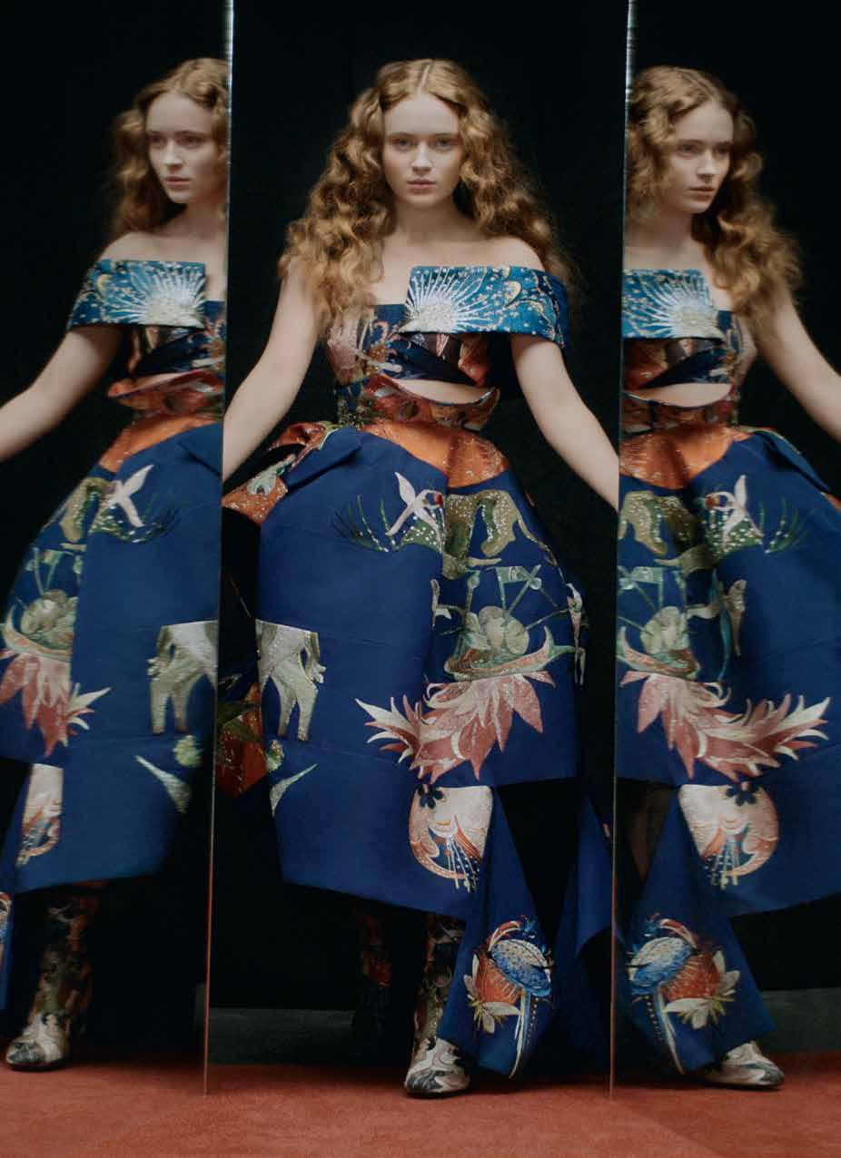 ï£ Metallic scale crossover top and skirt by Louis Vuitton. Konstantino Pythia sterling silver and 18K gold earrings, angelic guardian crystal doublet ring, and dome sterling silver and 18K gold 5-chain bracelet from Neiman Marcus.