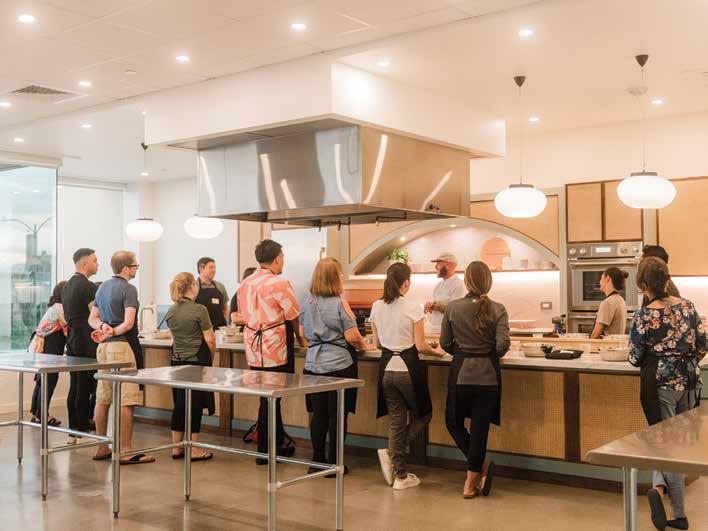 Founded in 2021 by Joe Di Condina, Hana Kitchens is a state-of-the-art facility featuring private and shared kitchens of various sizes; two ghost kitchens designed for made-to-order delivery items; and a chic midcentury modern show kitchen for cooking classes, pop-up restaurants, private dinners, and content creation. The designated Class-A commercial kitchens are certified to meet stringent public health standards while also accommodating complex cooking activities. In the artfully designed show kitchen, for example, guests learn to cook a diverse array of cuisines and culinary techniques, from homemade pasta to lau lau.