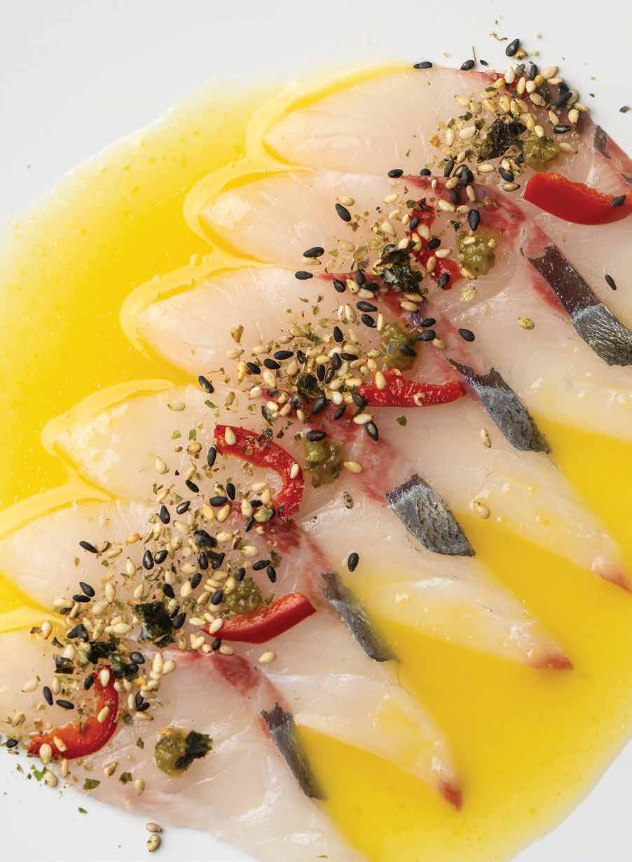There is a succulent Italian Crudo selection featuring Striped Jack and Black Snapper sliced perfectly to order. The Striped Jack is in a citrus miso sauce for brightness and umami with pickled Fresno chilies for some heat and house made oregano furikake.