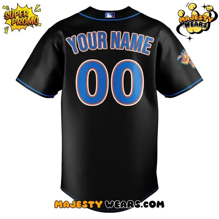 The Rocket City Trash Pandas x Lunáticos 2025 Custom Baseball Jersey features a sleek black base with vibrant blue and orange accents for a youthful and dynamic look.