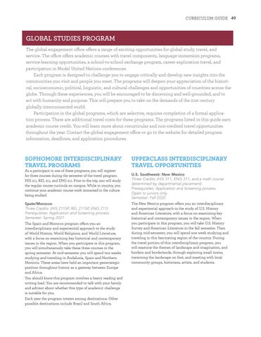 GLOBAL STUDIES PROGRAM The global engagement office offers a range of exciting opportunities for global study, travel, and service. The office offers academic courses with travel components, language-immersion programs, service-learning opportunities, a school-to-school exchange program, career exploration travel, and participation in Model United Nations conferences. Each program is designed to challenge you to engage critically and develop new insights into the communities you visit and people you meet. The programs will deepen your appreciation of the historical, socioeconomic, political, linguistic, and cultural challenges and opportunities of countries across the globe. Through these experiences, you will be encouraged to be discerning and well-grounded, and to act with humanity and purpose. This will prepare you to take on the demands of the 21st century globally interconnected world. Participation in the global programs, which are selective, requires completion of a formal application process. There are additional travel costs for these programs. The programs listed in this guide earn academic course credit. You will learn more about cocurricular and non-credited travel opportunities throughout the year. Contact the global engagement office or go to the website for detailed program information, deadlines, and application procedures.