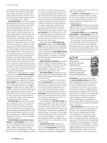 CLASS NOTES State Trooper), Tim (a wildlife biologist/ornithologist who works with shore birds on the Georgia coast), and Ben (a musician, artist, teacher, who with his wife works with them in L’Abri). They are blessed with six grandchildren ranging in age from 2 to 6, and they hope to be at reunion. Pam Johnson Smith has not been in touch with Northfield friends for many years, but writes that age 65 brought wisdom and more, and she wishes to reconnect and hopes that anyone who visits Mount Desert Island, Maine, will look her up in Southwest Harbor. This former alto, who is now a mezzo, sings in a small community chorus, in a hospice group called Evensong (which sings at the bedsides of folks in their homes, nursing homes, retirement homes, and hospitals), and in a superb choir in St. Saviours Episcopal Church in Bar Harbor, Maine. Her bumper sticker reads: “When words fail, music speaks.” Free time is spent walking in Acadia National Park, reading voraciously, and always trying to live outside her comfort level… she recently traveled to Ecuador as part of the local Hancock Medical Mission. Pam shares her home with a good friend of many years and has two sons. She and son Benjamin (35) are bound by Words with Friends (a potentially addictive game like Scrabble) on their iPhones. Her elder son, Jonathan, lives in Colorado and is the father of Eli (3). Pam writes: “I continue to work in my private massage practice and have the privilege of working with caregivers who are seeing to the well-being of their loved ones in hospice care. It is work that is profoundly moving and always humbling.” Another classmate who would enjoy a visit from anyone in the area is Marcia Eastman Congdon in Tucson, Ariz. This past year, she and husband, George, who winter in Arizona and summer in N.H., sold their home in Milford, N.H. Daughter Nancy Congdon ’89, who had been living in the New Hampshire home, relocated to Arizona and now lives only eight miles away. Their son John Congdon ’94, father of Julia (4) and Ryan (8), lives in Worcester, Mass. He recently received the Martin Luther King Chancellor’s award for integrity at UMass Medical School. Marcia continues to crochet for charity and create silver jewelry. George sells his wooden wares at three craft fairs each month. Marcia and George will be at reunion. Sue Creasy Case writes from Wisconsin that she is wrestling with when to retire. She is responsible for the multistate bar exam used to license lawyers across the country. Husband, Bob, who retired in ’01 from his career as a college professor, keeps busy gardening and building furniture. Their five grandchildren range in age from 4 to 22. The oldest has graduated from college and is gainfully employed, with benefits, every parent’s and grandparent’s dream come true. Vivien Gall Gibney, Joanne Westin, Wendy Moonan, and Jean Thompson sent me news tidbits. Vivien and husband Noel are retired, travel often to “escape the dreary, British weather,” and sadly are unable to attend reunion. Joanne has been retired from teaching biology at Case Western Reserve for four years, but she subbed for a semester