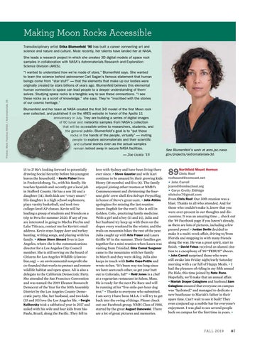 Making Moon Rocks Accessible Transdisciplinary artist Erika Blumenfeld ’90 has built a career connecting art and science and nature and culture. Most recently, her talents have landed her at NASA.