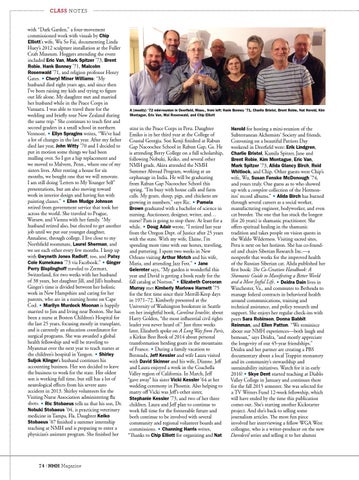 CLASS NOTES with “Dark Garden,” a four-movement commissioned work with visuals by Chip Elliott’s wife, Wu So Fai, documenting Linda Huey’s 2012 sculpture installation at the Fuller Craft Museum. Hoggers attending the event included Eric Van, Mark Spitzer ’73, Brent Robie, Hank Bonney ’71, Malcolm Rosenwald ’71, and religion professor Henry Gates. • Cheryl Miner Williams: “My husband died eight years ago, and since then I’ve been raising my kids and trying to figure out life alone. My daughter met and married her husband while in the Peace Corps in Vanuatu. I was able to travel there for the wedding and briefly tour New Zealand during the same trip.” She continues to teach first and second graders in a small school in northern Vermont. • Ellyn Spragins writes, “We’ve had a lot of changes in the last year. After my father died last year, John Witty ’70 and I decided to put in motion some things we had been mulling over. So I got a hip replacement and we moved to Malvern, Penn., where one of my sisters lives. After renting a house for six months, we bought one that we will renovate. I am still doing ‘Letters to My Younger Self ’ presentations, but am also moving toward work in interior design and having fun with painting classes.” • Ellen Mudge Johnson retired from government service that took her across the world. She traveled to Prague, Warsaw, and Vienna with her family. “My husband retired also, but elected to get another job until we put our younger daughter, Annaliese, through college. I live close to my Northfield roommate, Laurel Sherman, and we see each other every few months. I keep up with Gwyneth Jones Radloff, too, and Patsy Cole Kumekawa ’73 via Facebook.” • Ginger Perry Bisplinghoff traveled to Zermatt, Switzerland, for two weeks with her husband of 38 years, her daughter Jill, and Jill’s husband. Ginger’s time is divided between her holistic work in New Hampshire and caring for her parents, who are in a nursing home on Cape Cod. • Marilyn Murdock Moonan is happily married to Jim and living near Boston. She has been a nurse at Boston Children’s Hospital for the last 25 years, focusing mostly in transplant, and is currently an education coordinator for surgical programs. She was awarded a global health fellowship and will be traveling to Myanmar over the next year to teach nurses at the children’s hospital in Yangon. • Shirley Suljok Klinger’s husband continues his accounting business. Her son decided to leave the business to work for the state. Her oldest son is working full time, but still has a lot of neurological effects from his severe auto accident in 2013. Shirley volunteers for the Visiting Nurse Association administering flu shots. • Ric Stobaeus tells us that his son, Dr. Nobuki Stobaeus ’04, is practicing veterinary medicine in Tampa, Fla. Daughter Keiko Stobaeus ’07 finished a summer internship teaching at NMH and is preparing to enter a physician’s assistant program. She finished her