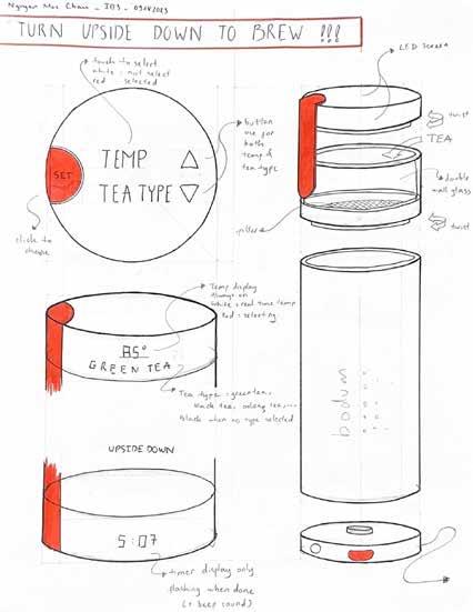 In the sketch ideation phase, I deliberated between a larger, countertop tea brewer and a portable to-go bottle for the Bodum brand. Ultimately, the decision leaned towards the to-go bottle, driven by a strategic vision to expand Bodum’s outdoor product offerings.