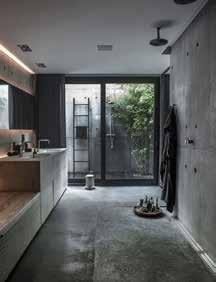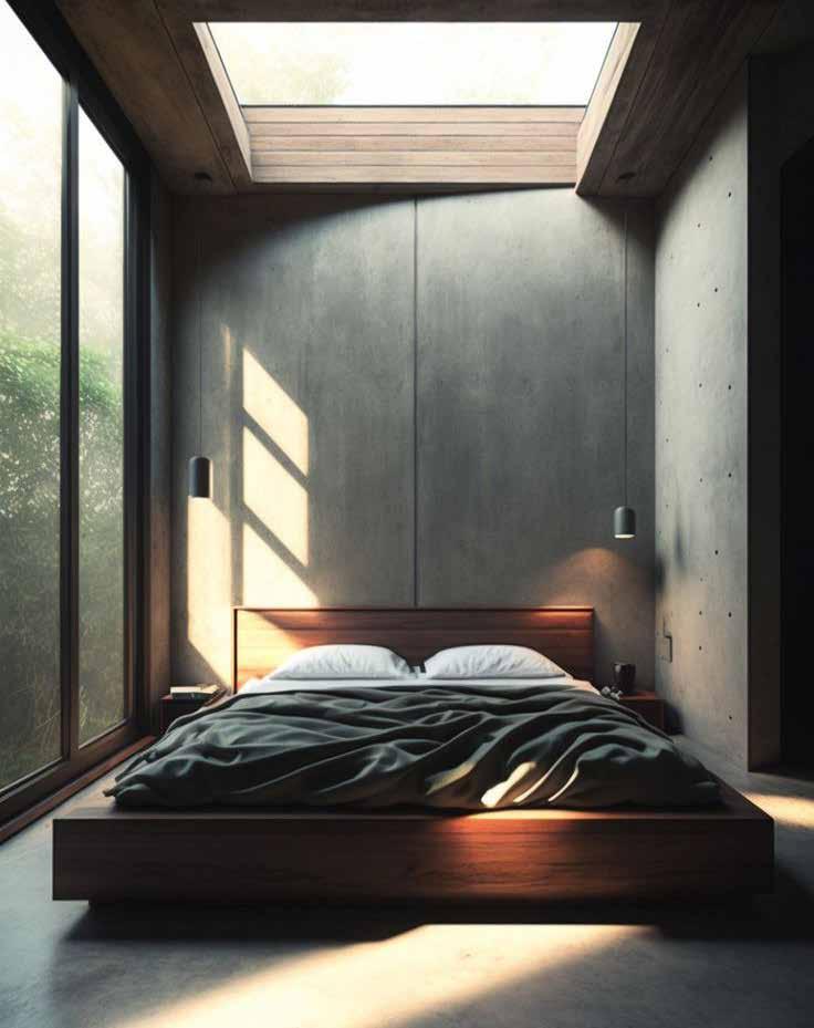 Brutalism, concrete, with thin, long light, and chrome elements, featuring a grayscale color palette