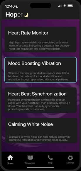 Using the app, users can customize vibration frequency for a personalized experience—tailoring it to their liking. The app also tracks emotions, offering advice for anxiety relief using bone conductor technology. Notably, the device functions independently, requiring no app interaction ex cept for snoozing.