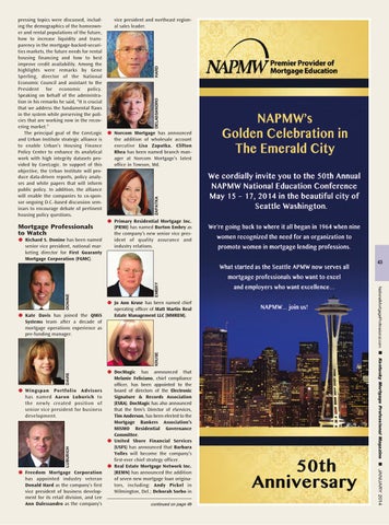 l DocMagic has announced that Melanie Feliciano, chief compliance officer, has been appointed to the board of directors of the Electronic Signature & Records Association (ESRA). DocMagic has also announced that the firm’s Director of eServices, Tim Anderson, has been elected to the Mortgage Bankers Association’s MISMO Residential Governance Committee. l United Shore Financial Services (USFS) has announced that Barbara Yolles will become the company’s first-ever chief strategy officer. l Real Estate Mortgage Network Inc. (REMN) has announced the addition of seven new mortgage loan originators, including: Andy Pickel in Wilmington, Del.; Deborah Sorbo in continued on page 49