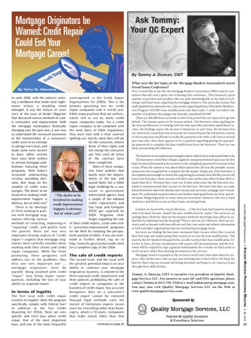 In early 2008, with the industry enter- unrecognized, is the Credit Repair ing a meltdown that made most night- Organizations Act (CROA). This is the mares serene, a troubling trend primary governing law for credit emerged. It was the feature of cover repair companies and it strictly prostory of the issue of Broker Magazine hibits many practices that are unfortuthat discussed various methods of cred- nately still in use by many credit it restoration and improvement. With repair companies today. For a credit the mortgage marketplace drastically repair company to be compliant with changing over the past year, it was easy the most basic of CROA regulations, to understand the increased awareness they must start with a clear contract in the maximization of a consumer’s spelling out exactly what they will do credit score in an attempt for the consumer, inform to salvage every loan, and them of their rights and make some extra income not charge the consumer to boot. Other articles any fees until all terms have since been written of the contract have in several mortgage pubbeen completed. lications featuring these Many of these compaprograms. With today’s nies have policies that increased underwriting barely meet the requirescrutiny, providing deciments of the law, and sions that hang on the would likely fail a CROA smallest of credit score legal challenge by a conmargins. The desire to be sumer or government involved in making credit enforcement agency. Even “The desire to be improvement happen is a couple of the national involved in making obvious, but at what cost? credit repositories and credit improvement There is no shortage Fair Isaac and Company happen is obvious, of firms looking to part(FICO) got surprised by but at what cost?” ner with mortgage origCROA litigation chalinators offering various lenges regarding the sale methods of correcting, improving or of their credit reports, scores and cred“repairing” credit, and profits from it correction/improvement programs the process there are two very on the Web for violating the pre-payimportant missing aspects of “credit ment portion of CROA. If you are interrepair”—aspects that mortgage orig- ested in further detail, log on to inators must carefully consider when http://www.ftc.gov/ro/chro/credit.shtm working with their clients and credit for a complete copy of the CROA. repair companies. While the firms promoting these programs will The sale of credit reports address one of the problems, they The second issue, and the issue with miss one very important one … the greatest potential impact on your mortgage originators must be ability to continue your mortgage warned: Being involved with credit origination business, is related to the “repair” may bring major conse- three national credit repositories and quences, including the loss of your their policies prohibiting the sale of ability to originate loans! credit reports to companies in the business of credit repair. Any accurate In terms of legality derogatory data on a consumer’s The first issue with credit repair credit report cannot be removed involves its legality. Does the program through legal methods until the specifically comply with federal law? statute of limitations expires (seven In addition to the Fair Credit years for everything other than bankReporting Act (FCRA), there are very ruptcy, which is 10 years). Companies specific and strict laws about credit that make claims other than that repair. One of the most important continued on page 28 laws, and one of the most frequently