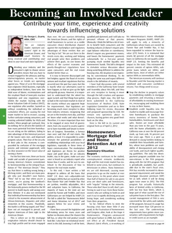 his Administration’s Home Affordable Refinance Programs (HARP), HARP 2.0, will apply to only a minority of Californians whose loans are owned by Fannie Mae and Freddie Mac, it has been expanded to remove the loan-tovalue (LTV) limits. It is estimated that nearly 60 percent of all the mortgage loans in California do not qualify under HARP 2.0, limiting the benefits and impact in the state. This estimated 60 percent consists of option ARMs, subprime loans (which are ARMs), and jumbo loans, most of which are either option ARMs or intermediate ARMs. The American economy will continue to flounder until the housing market is stabilized and consumer confidence returns. Two things need to occur: Stop the decline in property values by establishing stability in mortgage payments and returning a measure of affordability to existing homeowners, encouraging and enabling them to stay in their homes. Establish credit liquidity into the market to enable and encourage firsttime homebuyers to purchase the excess inventory of homes from homebuilders, foreclosures and short sales. Homes are more affordable than any time in the past 15 years, with the home affordability rate in California now at over the 60 percent mark, up from only 16 percent just five years ago. There is a pent up demand in young families looking to establish their households and families, whose twin problems are availability of downpayment and closing cost funds, and much tighter qualifying guidelines. The only low downpayment program available now for non-veterans is the FHA program; along with the Cal HFA program that is periodically available, but unreliable due to the state’s fiscal crisis. FHA has recently increased its downpayment requirement, and raised the mortgage insurance premium (MIP) fee as well, which it will be doing again twice more in 2012. The FHA program has actually historically been of limited utility in California, with too low loan limits, which is large part of what caused the rise of sub-prime loans in the first place. The current management of FHA is very concerned for the safety and viability of the program, because its usage has increased more than 120 percent in the last year. The underwriting requirements have gotten more conservative, with requirements for higher credit scores as an example. continued on page 44