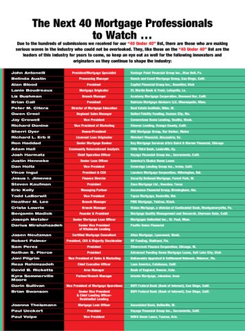 The Next 40 Mortgage Professionals to Watch … Due to the hundreds of submissions we received for our “40 Under 40” list, there are those who are making serious waves in the industry who could not be overlooked. They, like those on the “40 Under 40” list are the leaders of this industry for years to come, so keep an eye out as well for the following innovators and originators as they continue to shape the industry: John Antonelli