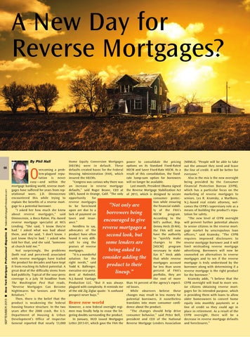 Home Equity Conversion Mortgages (HECMs) were in default. These defaults created havoc for the Federal Housing Administration (FHA), which insured the HECMs. “Congress was curious why there was an increase in reverse mortgage defaults,” said Roger Beane, CEO at LRES, based in Orange, Calif. “The only opportunity for reverse mortgages to be foreclosed upon are due to a lack of payment on taxes and insurance.” Needless to say, advocates of the product have often found it very difficult to sing the praises of reverse mortgages. “It is a wonderful solution for the right needs,” said Todd K. Ballenger, executive vice president at Holmdel, N.J.-based Vantage Production LLC. “But it was always plagued with complexity. It reminds me of the old Zig Ziglar quote: ‘A confused prospect never buys.’”