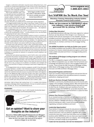 Imagine a world where wholesalers required anyone selling them loans, to be a member of a professional organization in order to have access to their products, and encouraged and supported mortgage loan originator (MLO) education. Ever notice how many nationally-recognized designations are available for Realtors? “If the biggest problem lenders What would wholesalers gain? A betface today is repurchases, maybe ter educated and more accountable broit’s time to consider prevention ker base. Imagine a world where an eduinstead of punishment.” cational advisory committee was comprised of wholesalers who were continually providing input on current issues and what education was needed with one constant goal: Quality originations. If the biggest problem lenders face today is repurchases, maybe it’s time to consider prevention instead of punishment. The quality of loans is still not where it needs to be. Originators submit poorly structured loans, loans that are non-compliant, or worse, loans that are fraudulent. The solution is easy … the implementation is challenging at best, but not insurmountable. According to FraudBlogger.com,2 fraud is up 55 percent from the first quarter of 2010 to the second quarter of 2010 … an interesting fact if true, now that banks are originating the lion’s share of the business. “The government’s push to bring mortgage fraudsters to justice is certainly welcome, but the cases brought to date represent only the tip of the iceberg in terms of how much fraud was actually committed during the real estate boom,” said Ann Fulmer, vice president business relations at Interthinx. “It’s sobering to know that only a small minority of cases are ever prosecuted, and it ought to serve as a reminder that the industry must protect itself by focusing on prevention.” Prevention starts with awareness. Codes of ethics, professional mindsets, education and ongoing learning, is what it takes to originate quality loans. I may be going out on a limb here, but maybe individuals who want to fly under the radar, not participate in industry efforts and only take the bare minimum to get by may be the ones that wholesalers have the trouble with. Can investing time and money to belong to an association be indicative of a propensity toward compliance and ethical behavior? Joining state and national associations in and of itself is only a start and does not guarantee the existence of ethical behavior. However, it’s a good place to start. To encourage participation, wholesalers could strongly suggest that they want brokers who demonstrate professionalism. The more brokers, the more the associations can protect the broker channel. While we have taken the brunt of it all over the last year or two, as long as we are still here, we should try new strategies and make a concerted effort to change our thinking to match what is happening in our industry. For mortgage brokers who are viewed as scapegoats, wouldn’t it have been great if everyone had been a member of the National Association of Mortgage Brokers (NAMB)? Wouldn’t it have been great if we were all members of a strong trade association that could have had more resources to protect the brokers and originators who are now fighting the fight of their lives? Would it have been a wise thing to support an association like NAMB that had hundreds of members fighting for the benefit of non-members? Oh, and the cost … simply one processing fee every year! We are under attack because originators making hundreds of thousands of dollars per year, wouldn’t part with just $350. Who do we have to blame, really?