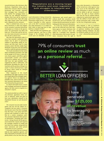 around disclosure after disclosure after disclosure. Regulations today seek to inform the consumer about everything backwards and forwards regarding their mortgage loan. Consumers are told whether the mortgage broker or lender has any affiliated businesses, whether their loan will be serviced or sold, and much more. Page after page after page require notice and consent with a signature by the consumer. What is omitted from every one of these disclosures is what may happen to the consumer’s personal and private information as it relates to the government. The government very likely will look at it—at any time and for any reason. How many consumers are aware of this? My bet is almost none. Why does the government make it a secret that consumer confidential information may be given to government auditors? Is big brother spying on consumers and they don’t want to make everyone aware? Did they simply forget during the recent year’s new rule-making sessions to add this particular disclosure? The Fourth Amendment to the United States Constitution guarantees “the right of the people to be secure in their persons, houses, papers, and effects, against unreasonable searches and seizures, shall not be violated, and no warrants shall issue, but upon probable cause, supported by Oath or affirmation, and particularly describing the place to be searched, and the persons or things to be seized.” In short, Americans have a right to privacy which cannot be infringed upon without cause. What happened to the Fourth Amendment and right to privacy? It has been largely ignored by mortgage regulatory agencies. There is no subpoena, no probable cause, and no reason for someone’s personal information to be seized and reviewed by the government. In a March 2014 letter from a certain state mortgage and financial regulatory agency, the state wrote in response to a consumer’s request: