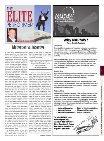 NAPMW Butt sinc since women NAP MW is not a women’s women’s organization. organization. Bu ew omen make majority profesup the major ity off professionals professionals in the mortgage/banking morrtgage/banking pr ofespurpose sion, our pur pose is to to help them advance advance in business, business, personal, personal, and leadership development. de evelopment.