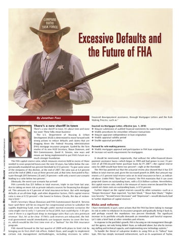 Risks and reforms I have mentioned, in part, some actions that the FHA has been taking to manage its risk in order to rebalance its insurance program and gradually bring it back to, and perhaps exceed the mandatory two percent threshold. The significant increase in its portfolio virtually demands an immediate and forceful response. Let’s take a brief look at other remedies and reforms. In response to the portfolio’s growth, FHA is focusing on risk management throughout the agency, not only hiring Robert Ryan, as indicated above, but also by increasing staffing and technical capacity, and implementing new technology systems.11 To handle the threat of sub-prime lenders to using FHA as its “fallout” loan type, FHA has steeply increased enforcement, such as its suspension of Taylor,