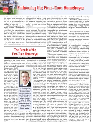 Wayne Gretzky, the National Hockey Now, many of you will argue that the League Hall of Famer, once told a first-timers who accounted for roughly reporter, “A good hockey player plays 50 percent of all home sales last year where the puck is. A great hockey play- was an anomaly; that this new record er plays where the puck is going to be.” was driven purely by the temporary This philosophy should “fix” of the first-time be no different for a homebuyer tax credit. mortgage loan originator, But before you go back to since we too must adapt your desk and pick up the to the market environphone to buy more refi ment around us. Where and loan modification do you think the puck is leads, let’s take a look at going to be over the some facts. course of the next year (or First, every major con10) and how have you sumer trend in our history positioned yourself to has been driven by our take advantage of it? demographics, most notably, Clearly, much of the the Baby Boomer Generation mortgage market over the which drove the sale and “… the average age past year has been driven of first-time buyers is development of everything by refinancing and firstfrom disposable diapers to 33, we should feel time homebuyer purchasmutual funds. As these es. The refinancing mar- confident that as this Boomers age and move population segment ket has been as dependinto their non-income ages, they will be able as the seasons for earning years, the conthe past couple of sumer effect of Boomerlooking for homes, decades. You could rest related cohorts will begin just as the Baby assured that every few Boomers did, provid- to diminish. Who, if anyyears would bring a rate ing fertile ground for one, will take their place? reduction that would The growth of our populahomeownership drive homeowners to the tion, and the characterisopportunities for a refinancing table as pretics of the consumer, will decade or more.” dictably as geese migratbe driven once again by ing south for the winter. immigration as it was for However, the future economic environ- the early part of the 20th Century. Unlike ment will challenge this cycle and likely many industrialized countries, the U.S. change the dynamics of our business still benefits greatly from immigration. significantly. One thing we will continue While our birth rate is roughly the poputo be able to count on, however, is the lation replacement rate, our population strength of the first-time homebuyer growth rate of one percent is at or above market. the world average, which is significant