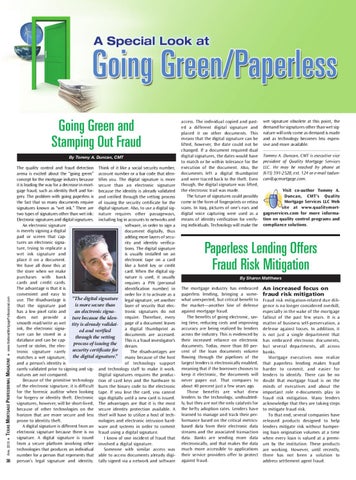 The quality control and fraud detection Think of it like a social security number, arena is excited about the “going green” account number or a bar code that idenconcept for the mortgage industry because tifies you. The digital signature is more it is leading the way for a decrease in mort- secure than an electronic signature gage fraud, such as identity theft and for- because the identity is already validated gery. The problem with going paperless is and verified through the vetting process the fact that so many documents require of issuing the security certificate for the signatures known as “wet ink.” There are digital signature. Also, to use a digital sigtwo types of signatures other than wet ink: nature requires other passageways, Electronic signatures and digital signatures. including log in accounts to networks and An electronic signature software, in order to sign a is merely signing a digital document digitally, thus pad or screen that capadding more layers of secutures an electronic signarity and identity verificature, trying to replicate a tions. The digital signature wet ink signature and is usually installed on an place it on a document. electronic tape on a card We have all done this at like a hotel key or credit the store when we make card. When the digital sigpurchases with bank nature is used, it usually cards and credit cards. requires a PIN (personal The advantage is that it is identification number) in convenient and easy to order for it to activate as a “The digital signature use. The disadvantage is legal signature, yet another is more secure than that the signature pad layer of security that elechas a low pixel ratio and an electronic signatronic signatures do not does not provide a ture because the iden- require. Therefore, every smooth read/write as wet tity is already validat- page of a document leaves ink, the electronic signaa digital thumbprint as ed and verified ture can be stored in a documents are accessed. through the vetting database and can be capThis is a fraud investigator’s process of issuing the tured or stolen, the elecdream. tronic signature rarely security certificate for The disadvantages are matches a wet signature, the digital signature.” many because of the host and a person’s identity is of technology support rarely validated prior to signing and sig- and technology staff to make it work. natures are not compared. Digital signatures requires the producBecause of the primitive technology tion of card keys and the hardware to of the electronic signature, it is difficult burn the binary code to the electronic for the forensic auditor when looking tape. If you lose the card, you cannot for forgery or identity theft. Electronic sign digitally until a new card is issued. signatures, however, will be short-lived, The advantages are that it is the most because of other technologies on the secure identity protection available. A horizon that are more secure and less thief will have to utilize a host of techprone to identity theft. nologies and electronic intrusion hardA digital signature is different from an ware and systems in order to commit electronic signature because there is no fraud using a digital signature. signature. A digital signature is issued I know of one incident of fraud that from a secure platform involving other involved a digital signature. technologies that produces an individual Someone with similar access was number for a person that represents that able to access documents already digiperson’s legal signature and identity. tally signed via a network and software