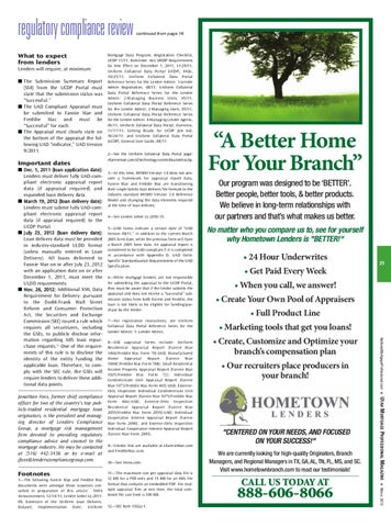 3—At this time, MISMO Version 3.0 does not provide a framework for appraisal report data. Fannie Mae and Freddie Mac are transitioning their single-family loan delivery file formats to the industry standard MISMO Version 3.0 Reference Model and changing the data elements required at the time of loan delivery. 4—See Lender Letter LL-2010-15. 5—UAD forms indicate a version date of “UAD Version 09/11,” in addition to the current March 2005 form date, while the previous form will have a March 2005 form date. An appraisal report is considered to be UAD compliant if it is completed in accordance with Appendix D, UAD FieldSpecific Standardization Requirements of the UAD Specification. 6—While mortgage brokers are not responsible for submitting the appraisal to the UCDP Portal, they must be aware that if the lender submits the appraisal and does not receive a “Successful” submission status from both Fannie and Freddie, the loan is not likely to be eligible for funding/purchase by the lender. 7—For registration instructions, see Uniform Collateral Data Portal Reference Series for the Lender Admin: 1- Lender Admin. 8—GSE appraisal forms include: Uniform Residential Appraisal Report (Fannie Mae 1004/Freddie Mac Form 70)-UAD; Manufactured Home Appraisal Report (Fannie Mae 1004C/Freddie Mac Form 70B); Small Residential Income Property Appraisal Report (Fannie Mae 1025/Freddie Mac Form 72); Individual Condominium Unit Appraisal Report (Fannie Mae 1073/Freddie Mac Form 465)-UAD; ExteriorOnly Inspection Individual Condominium Unit Appraisal Report (Fannie Mae 1075/Freddie Mac Form 466)-UAD; Exterior-Only Inspection Residential Appraisal Report (Fannie Mae 2055/Freddie Mac Form 2055)-UAD; Individual Cooperative Interest Appraisal Report (Fannie Mae Form 2090); and Exterior-Only Inspection Individual Cooperative Interest Appraisal Report (Fannie Mae Form 2095). 9—Vendor lists are available at eFannieMae.com and FreddieMac.com. 10—See Veros.com. 11—The maximum size per appraisal data file is 12 MB for a PDF-only and 15 MB for an XML file format that contains an embedded PDF. For multiple appraisal files at one time, the total combined file size limit is 100 MB. 12—SEC Rule 15G(a)-1.