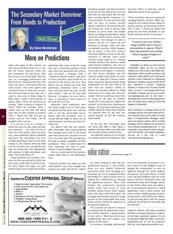For those seeking to take the pre“Financial markets can make you look qualification process a step further, really foolish, even if you thought your there are also helpful collateralanalysis was right, and still do. Today’s assessment tools that mortgage professionals can use to supplement their knowledge of a given market prior to making the commitment go through the application process. These tools • Nationwide Appraisal Company include the automated valuation • FHA and HVCC Compliance model (AVM) and access to local • Appraisals Multiple Listing Service (MLS) compa• BPO’s rable sales data. With these tools, the • AVM’s • National Vendor Network mortgage professional can get a rough • RealEC Integrated preview of the comparable sales data, • In Business Since 1970 which will be used by the appraiser to develop the appraisal. The customer can also be a resource in assisting with the preliminary evaluation of their collateral. A good question to start with is: “What has sold in your neighborhood that will support your 888-485-1999 Ext. 2 opinion of the value?” www.coesterappraisals.com In summary, mortgage professionals