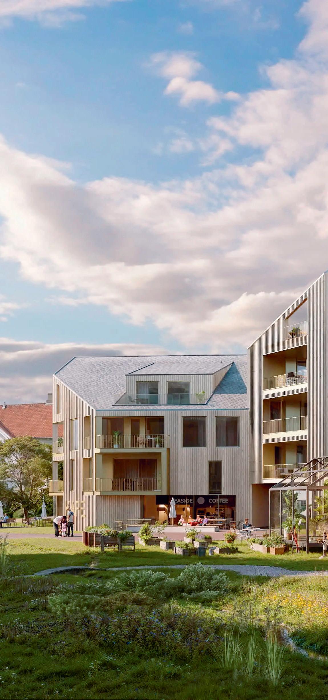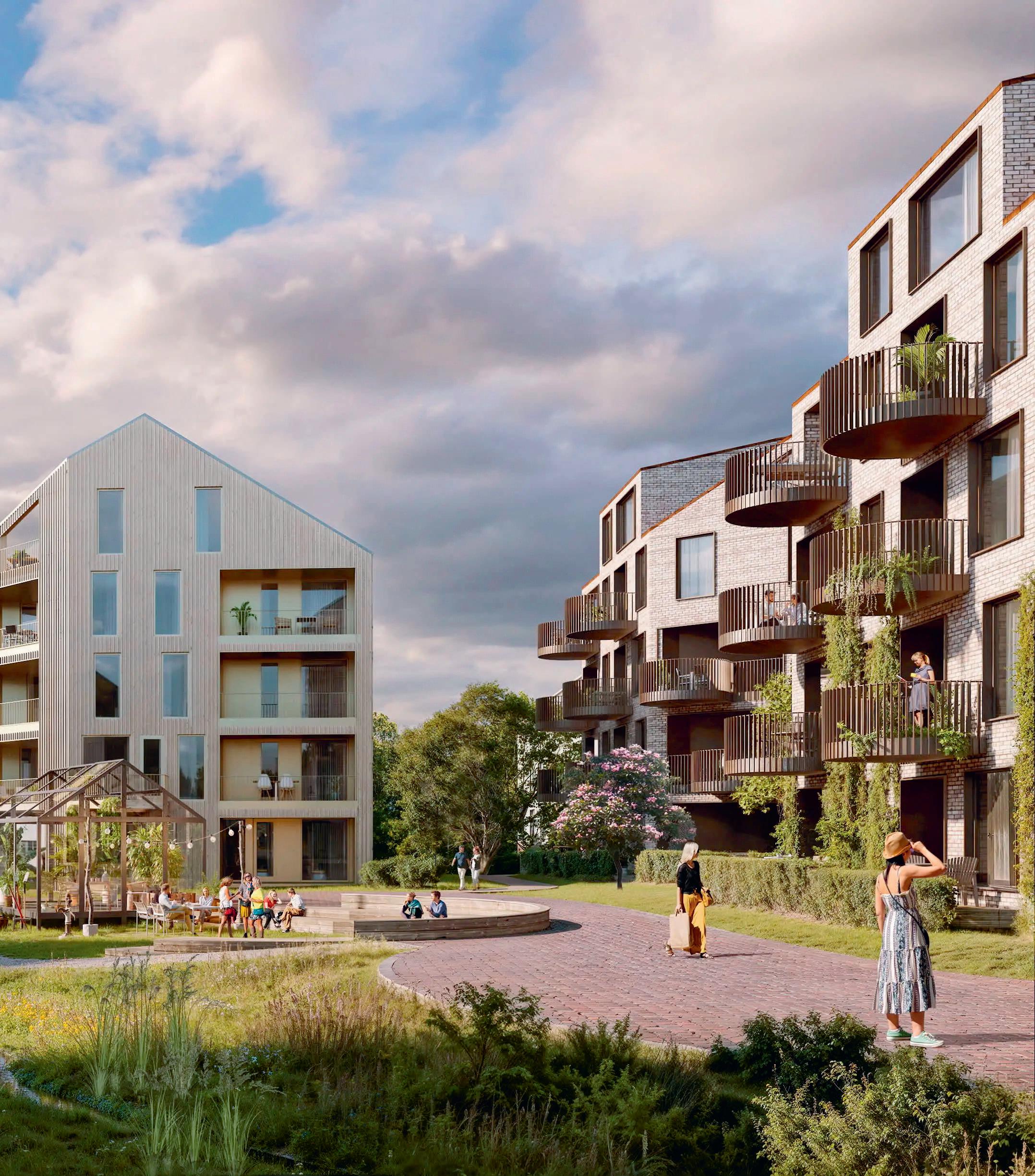 Mellom byggene planlegges det frodige uterom, møteplasser og sosiale soner som skal bidra til et inkluderende lokalmiljø.