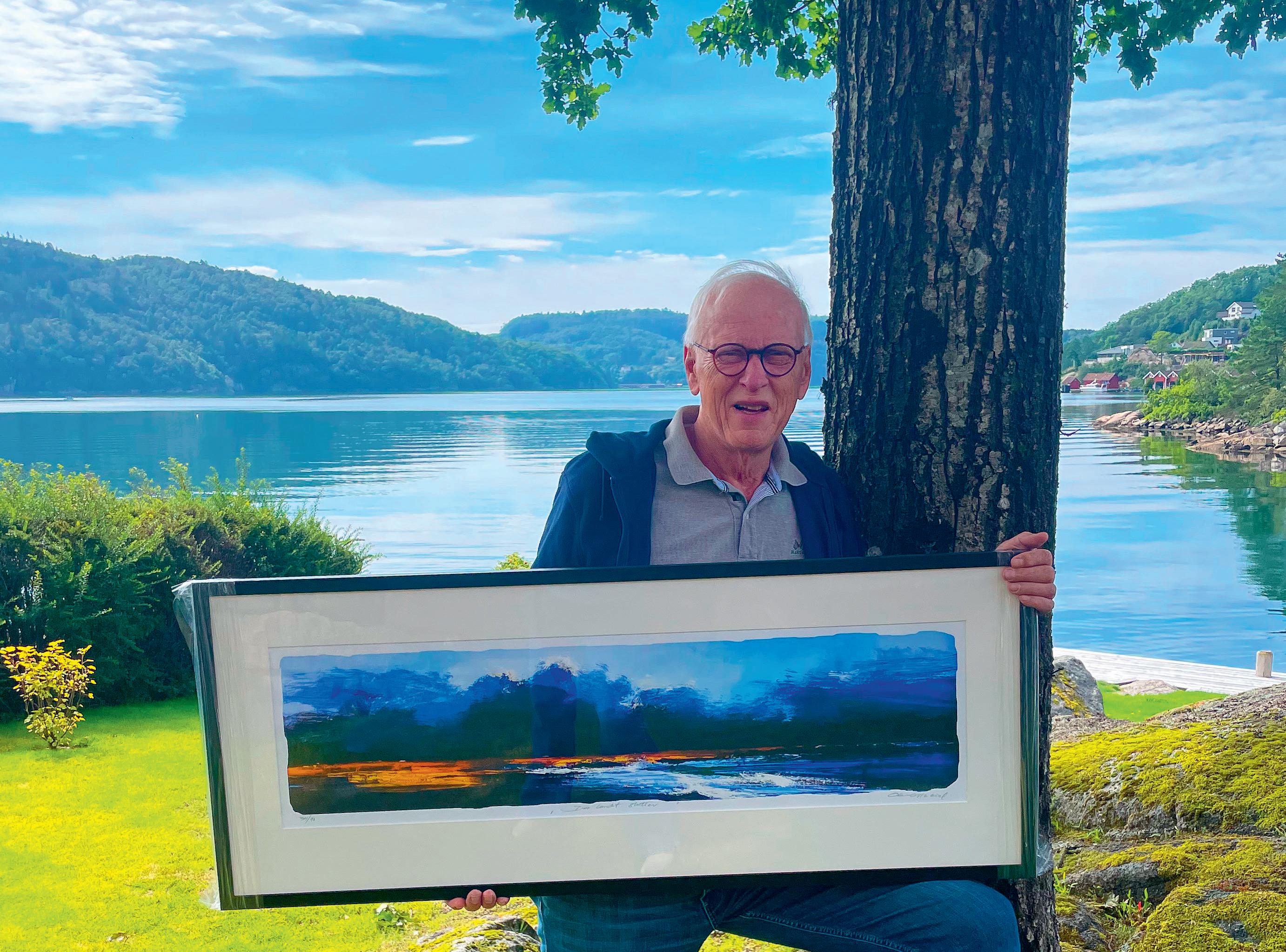 KUNSTNERGAVE: Ole Ertzeid i hagen med bildet til utlodningen på NMS-messa. Svennevigsbukta og Rosfjorden i bakgrunnen.
