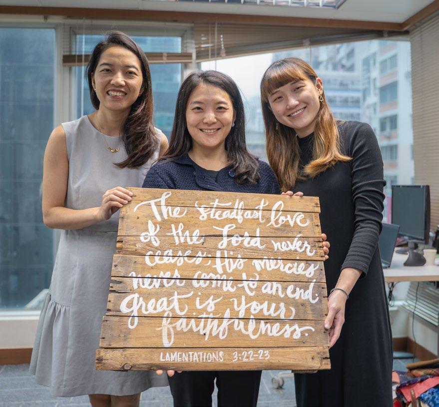 Staben i Sons and Doughters hilser med Klagesangene 3,22-23. F.v.: April Peng, programansvarlig, Ahyoung Baek, administrerende direktør og Jessie Cheung, driftsansvarlig. Foto: Maria Indrøy Risanger