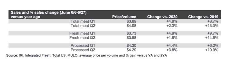 Across all measured meat and poultry items in the IRI universe, both fixed and random weight, the average price per pound volume stood at $3.89 in the first quarter of 2021 and rose to $4.08 in the second quarter. This constitutes an increase of 4.8 percent and 2.3 percent, respectively, versus the first and second quarters of 2020. However, prices were much higher in 2020 already amid supply constraints. When comparing first and second quarter prices to 2019, the increases were 8.7 percent and 13.3 percent, respectively. Both fresh and processed meat prices were up. www.marketingandtechnology.com/ repository/webstories/webst51479.png