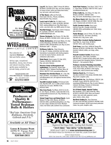 Lazy KT, Rick Skaarer, 2898 E. Kimzey Rd. Willcox, AZ 85643, 520/384-5210. Reg. and comm. Brangus; all classes of bulls, heifers and replacement heifers; reg. and comm. solid ranch horses; LP Bar Ranch, LaMar and Pat Clark, 6422 South 35th Ave., Phoenix, AZ 85041, 602/276-8354. Reg. Limousin. Lueck Land & Cattle Co., Dr. Wade Lueck, 2567 East Brooks St., Gilbert, AZ 85296, 480/5605625, wadelueck@gmail.com. Reg. Black Angus — comm. cross-bred cattle; reg. AQHA; pasture for lease. Mad Bull Designs, Todd Stewart, 6407 E Parkview Dr, Scottsdale, AZ 85257, 480/383-9800, todd@madbulldesigns.com. Marana Stockyards, Clay Parsons, P.O. Box 280, Marana, AZ 85653, 520/682-4400. Cattle sale barn. Mattox Beefmasters, Jeff & Sarah Mattox, P.O. Box 21445, Wickenburg, AZ 85358, 928/684-9571, 928/671-0398. jeffmattox@msn.com. Reg. & comm. Beefmaster cattle — all types. McElhaney Cattle Co., Patsy Echeverria, P.O. Box 277, Wellton, AZ 85356, 520/785-3384. Specializing in personalized cattle feeding programs to meet the needs of farmers, ranchers and professional cattle feeders. Monk Ranch, Dennis Layton, P.O. Box 3070, Thatcher, AZ 85552, 928/428-2596. Reg. and comm. Barzona.