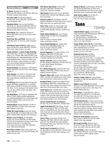 D2 Ranch, Dan Wade, Rt. 1 Box 40, Mountainair, NM 505/849-1158, 505/275-1804. Reg. Tarentaise, seedstock, heifer leasing. Del Curto Cattle, Joan Del Curto-Monette, P.O. Box 1661, Socorro, NM 87801, 505/423-1661. Comm. Beefmaster cattle. Donaldson Ranch, Clem and Joan Donaldson, ABO Rt. Box 1G, Mountainair, NM 87036, 505/4233257, 505/436-2372. Reg./comm. Simmental and Beefmaster, bulls, heifers, club calves. Dusty Ranch, Dale L. Henderson, P.O. Box 71, Winston, NM 87943, 575/772-5514. Reg. & comm. Angus cattle. Dwarf Fruit Trees and Plants, Andy Diaz, 5013 Solero Way, Salida, CA. Fruit trees, plants and vegetables. Field Ranch Land & Cattle Co., LLC, James A. Nance, P.O. Box 5457, Alamo, NM 87825, 575/8542805. Comm. Angus & Angus cross cattle. Hayden Outdoors / Cabelas Trophy Properties, 105 N. Main Street, .PO. Box 1112, Magdalena, NM 87825-1112, 575/854-3090, 800/462-4590, Lee@ HaydenOutdoors.com, www.HaydenOutdoors.com www. CabelasTrophyProperties. Contact Lee Scholes, Greg Liddle, Dax Hayden. Listing, marketing, and selling ranch and recreational properties throughout New Mexico and the mountain states. Henderson Ranch, Clay Henderson, 1520 Dusty Rt., Winston, NM 87943, 575/772-5764. Comm. Brangus & Angus x. Betty Houston, 515 Center St., SW, Socorro, NM 87801, 575/835-1422, houston_betty@msn.com. Real estate brokerage, residential, land, ranch, commercial. Iris Hill Farm, David & Jenny Anglen, P.O. Box 669, Bosque, NM 87006, djanglen@msn.com, 505/8610489 (house); 505/688-5454 (Jenny Cell). Katahdin Hair sheep - for sale asparagus & other garden produce - for sale. Also available at times: dairy goats, meat rabbits, & poultry The MarketPlace, 105 N. Main St., Magdalena, NM 87825, 575/854-3088, Lori@RanchoMagdalena. com, www.RanchoMagdalena.com. Retail saddles, gifts, Pendleton, jewelry, furniture, and new and used boots and clothing. McDaniel Ranch, Knollene McDaniel, P.O. Box 42, Claunch, NM 87011, 575/849-1456. Comm. Irish Black fullblood & cross calves. Middle Rio Grande Realty, Jeanene Hall, broker/ owner, P.O. Box 888, 413 California NW, Socorro, NM 87801, 505/835-0888, 800/687-2615. Real estate. Moeller’s Cross M Ranch, Dr. Fritz Moeller, P.O. Box 747, Socorro, NM 87801, 575/835-3866, 505/263-9216, fmoeller@sdc.org. Reg. & comm. Texas Longhorn females bred to reg. Angus bulls for F1 heifers, beef steeres, heifer bulls. Authorized dealer -RAU Animal Immobilizer. Rick Muncy Leathers, Make custom saddles, and repair saddles and tack. 11 US Hwy 380, Bingham, NM 87832, 575/423-3267