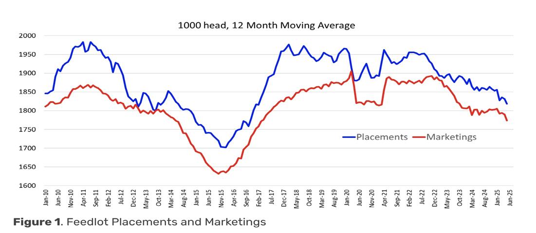 down 4.4 percent compared to the same period one year earlier. In fact, annual (12month) average monthly placements peaked cyclically in February 2018 and are down 8.0 percent as of May 2025 (Figure 1). The largest U.S. calf crop in this cattle cycle was in 2018 and has been getting smaller since then.